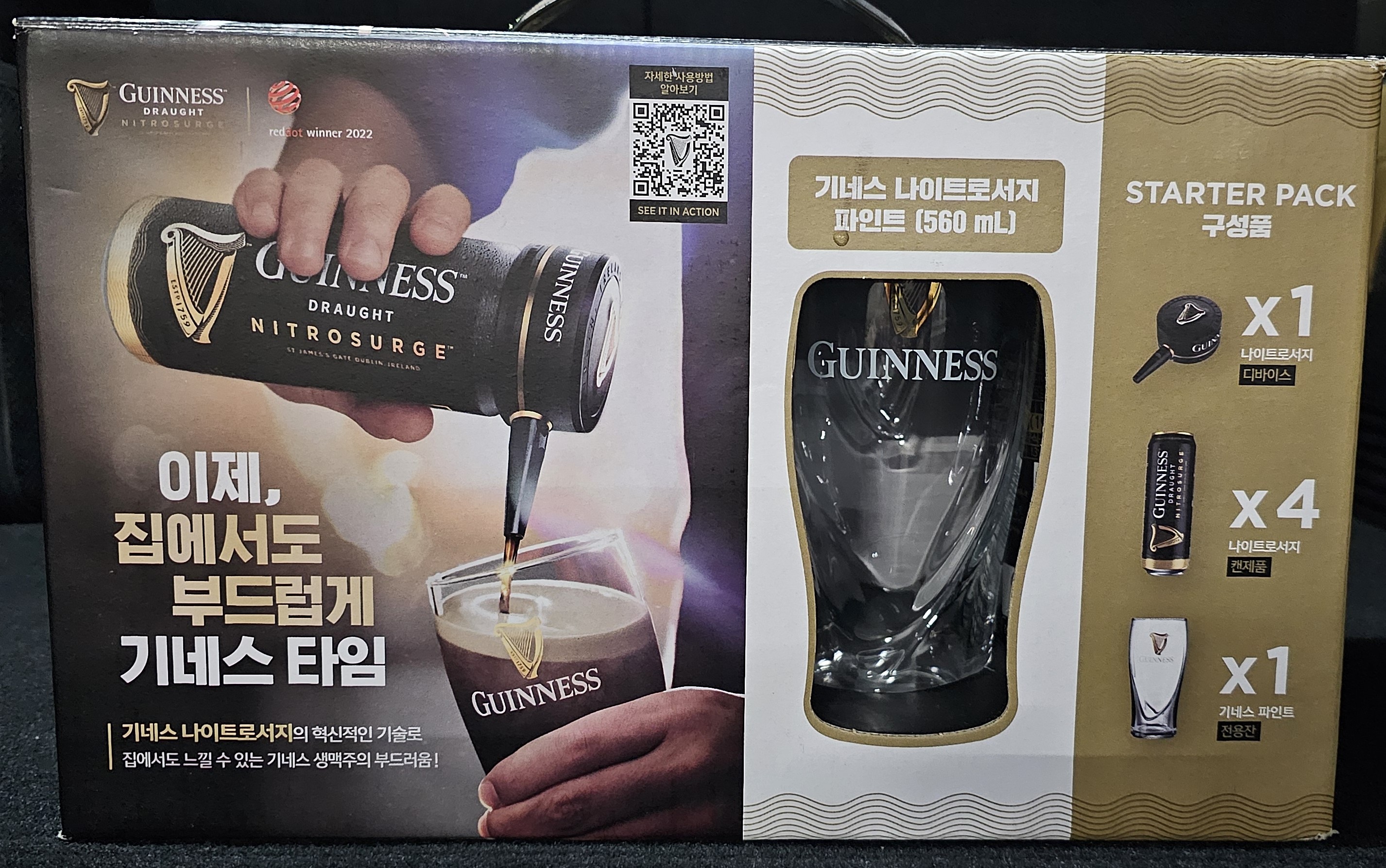 오랫동안 기네스 애호가들의 위시리스트 최상단에 자리했던 '기네스 나이트로서지'. 그동안 해외 직구로만 만나볼 수 있어 아쉬움을 삼켰던 이 제품이 드디어 지난 3월, 아시아 최초로 한국에 정식 출시되었습니다. 출시 소식만으로도 설렜지만, 연일 품절 소식이 들려와 애태우던 중, 어제 우연히 들른 GS25 편의점에서 '나이트로서지 스타터팩'을 발견하고 망설임 없이 구매했습니다.