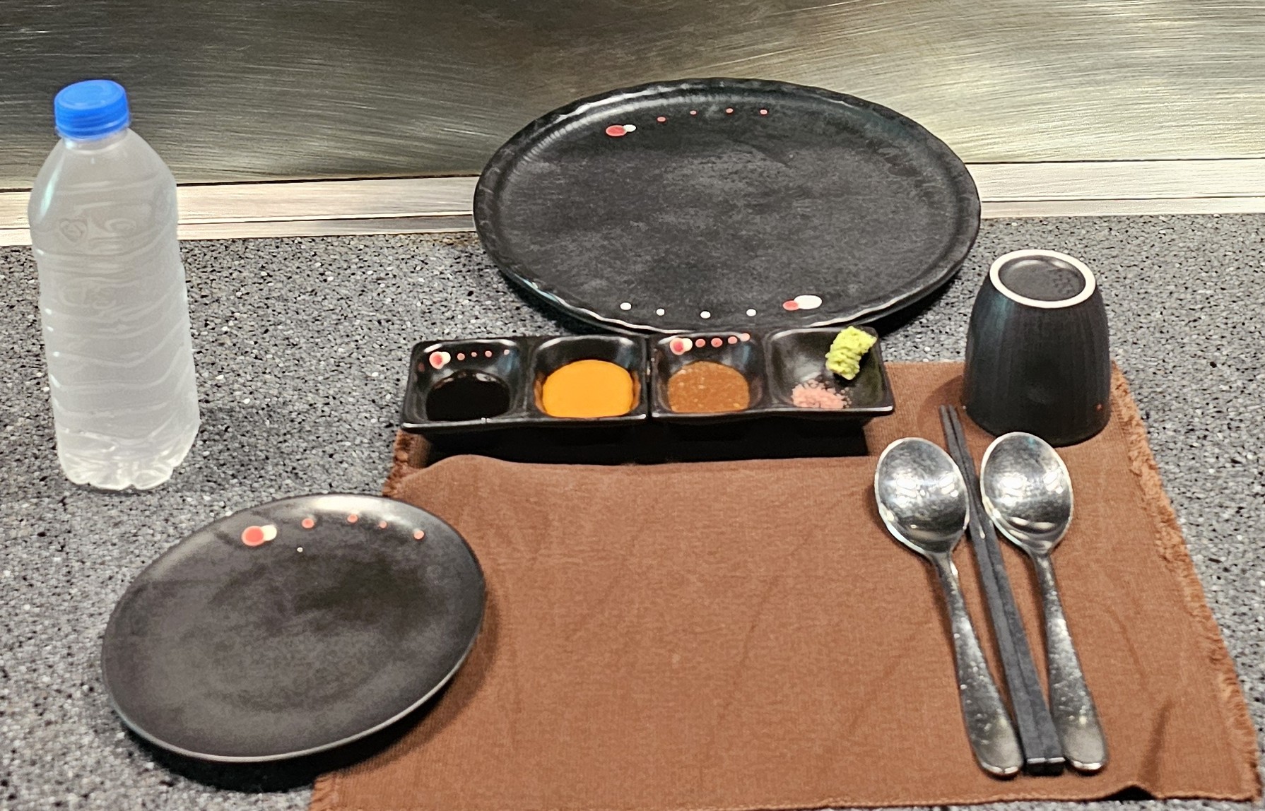 저희는 미리 예약을 하고 방문해서인지 자리에 기본 세팅이 정갈하게 준비되어 있었습니다. 음식을 따뜻하게 먹을수 있도록 그릇 일부가 철판쪽으로 올라가 있습니다. 대표 메뉴인 **'라이브 랍스터 세트'**를 주문하자, 곧이어 살아있는 랍스터를 직접 보여주셨습니다.