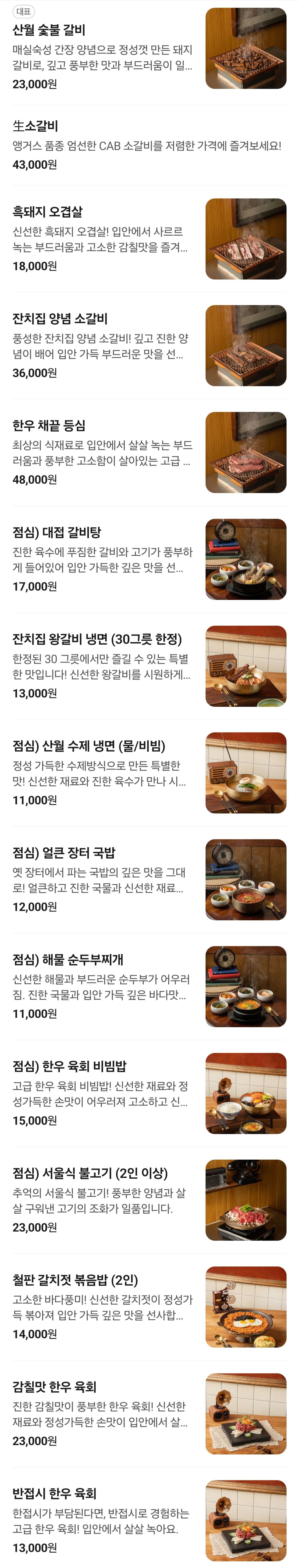 메뉴판을 보고 뭘 먹을까 잠시 고민하다가, 역시 처음 가는 집은 대표 메뉴를 먹어야죠? 고민 없이 이곳의 시그니처인 '산월 숯불갈비'를 주문했습니다.